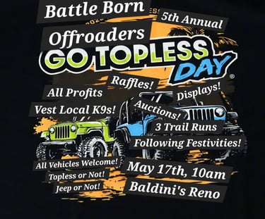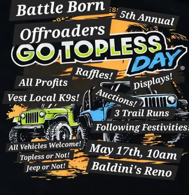 Our major group fundraiser is our 5th Annual Go Topless Day! This year we will be hosting at Baldini's Casino! We will be raffling off prizes that we get donated and will end our festivities with 3 separate trail runs to choose from! Fun time for all, Topless or not Jeep or not!