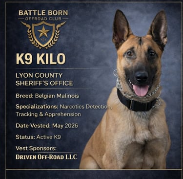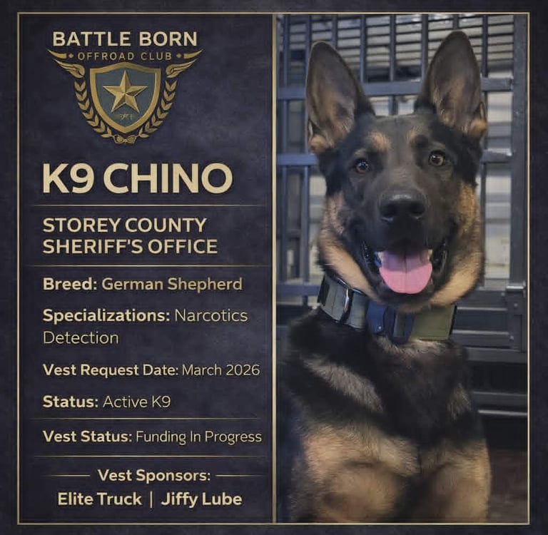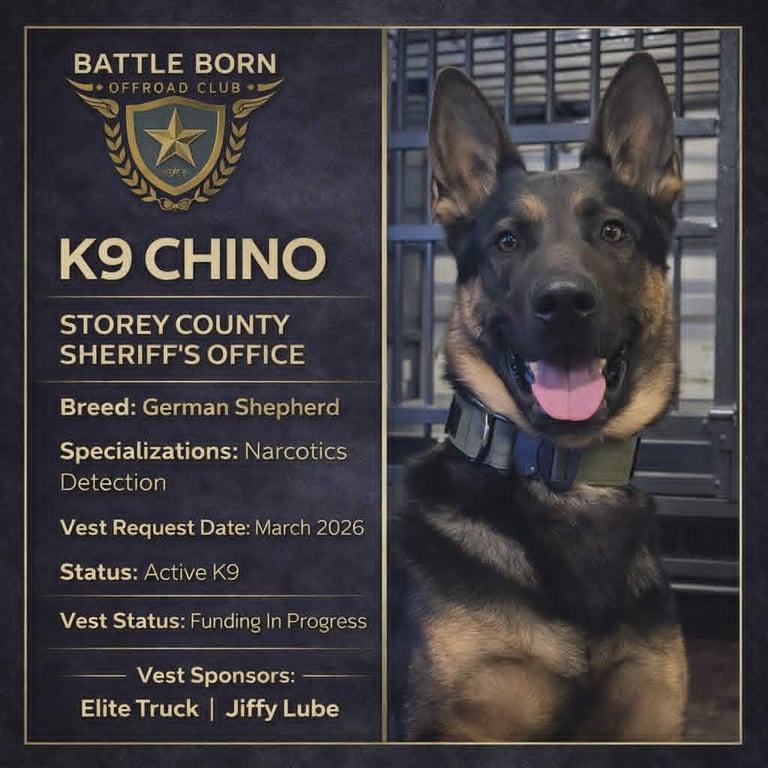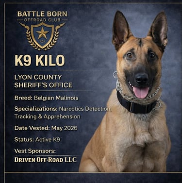 Every K9 featured here has been protected with a life-saving ballistic vest made possible by Battle Born Offroaders and our Supporters.